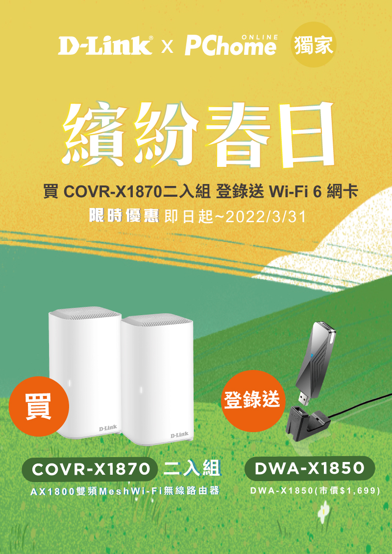 活動名稱:繽紛春日送好禮|PChome 購買COVR-X1870 二入組登錄送 DWA-X1850