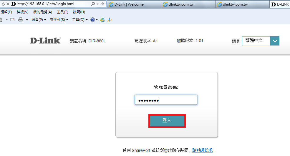 ,在網址列輸入「192.168.0.1」 使用者名稱: 管理者 (admin) 密碼: 無