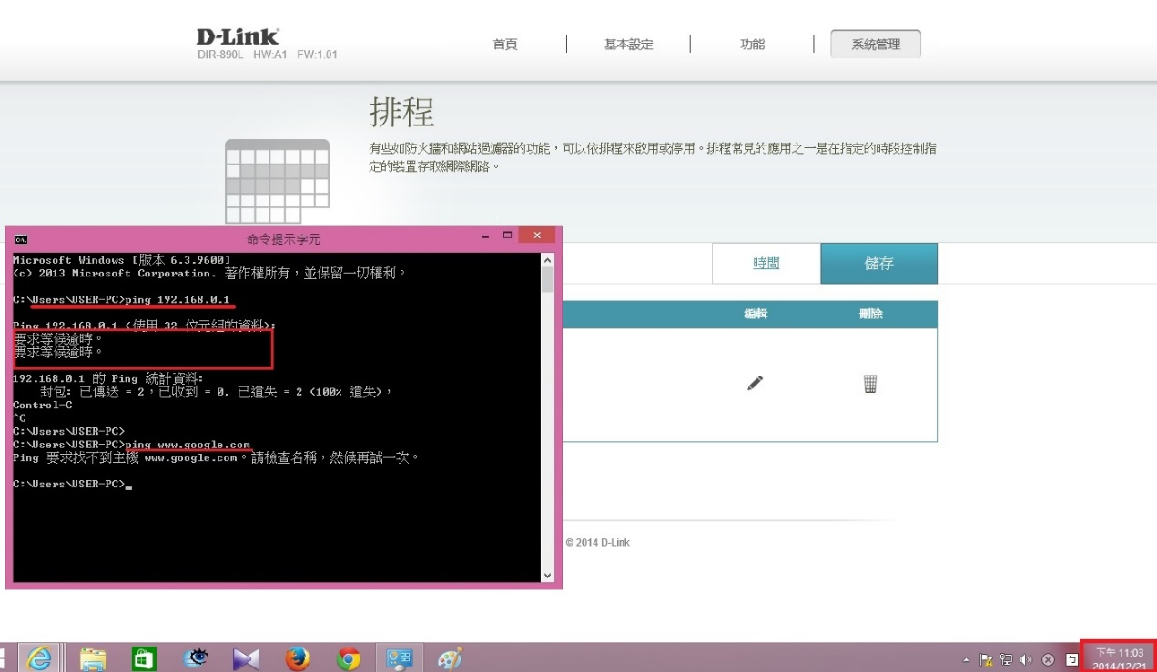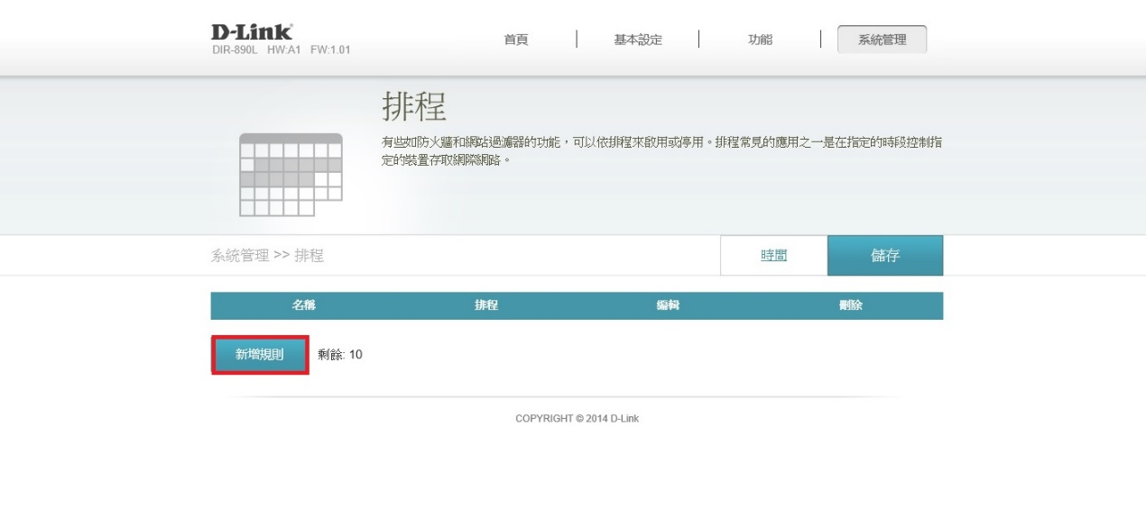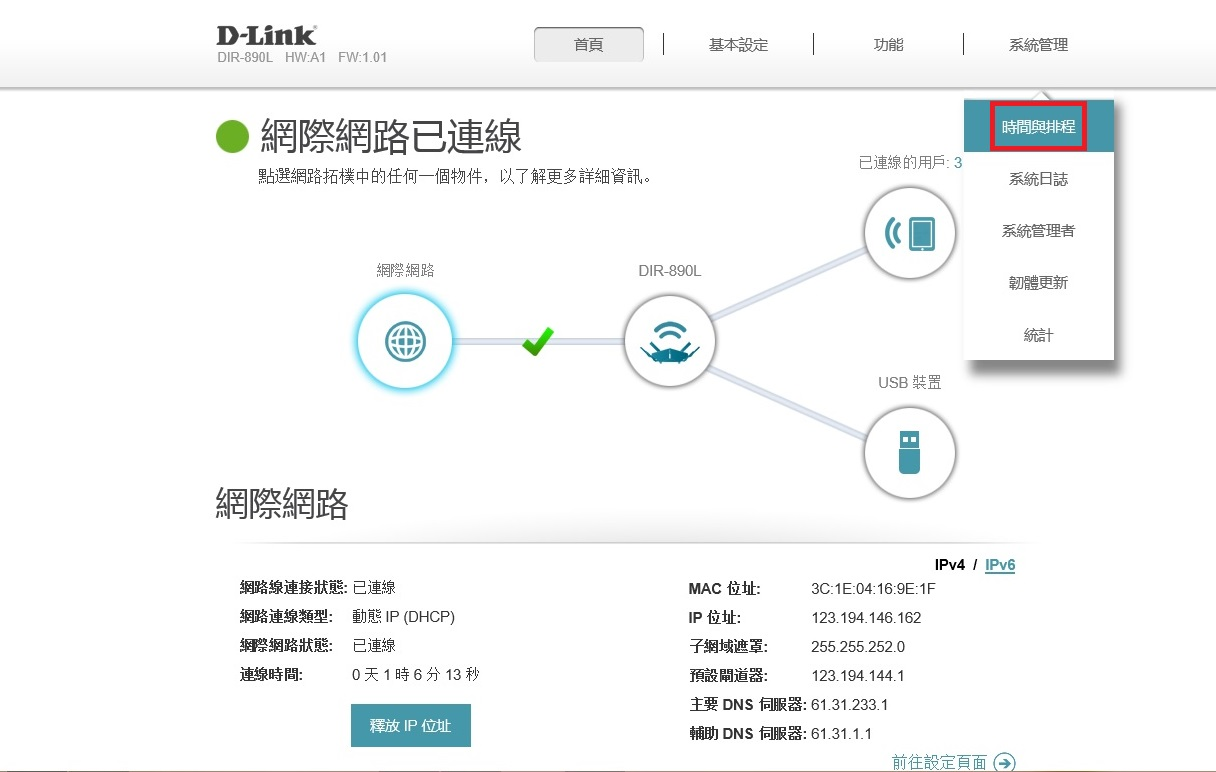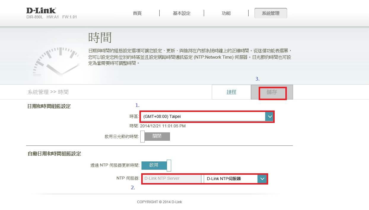 2. 請到 「系統管理」> 「時間與排程」 先將DIR-890L 進行校時