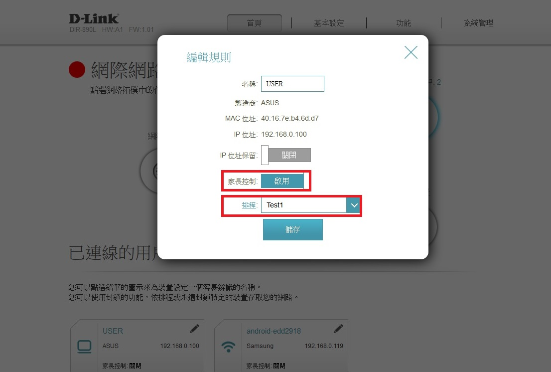 8. 開啟家長控制功能,並選擇套用Test1 此時間排程,點選儲存