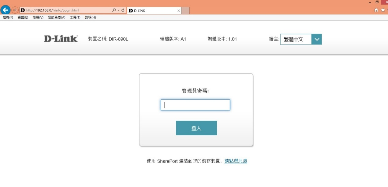 1.開啟 瀏覽器 ,在網址列輸入 192.168.0.1 到DIR-890L 管理頁面,管理員密碼預設為空白,點選登入