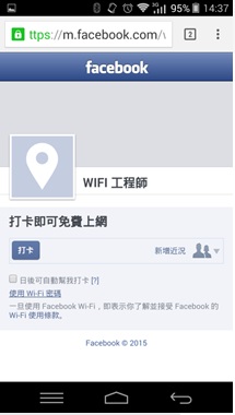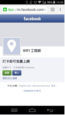 4.要出現 facebook.com網頁,按打卡後,就可以使用Wi-Fi上網了.