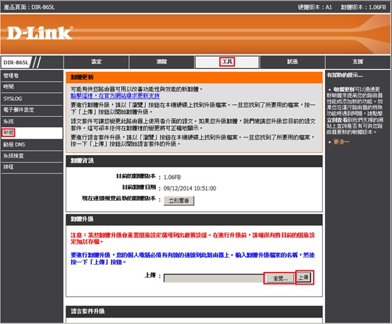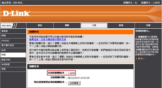更新產品DIR-865L韌體1.06FB,更新方法先登入到192.168.0.1設定頁面