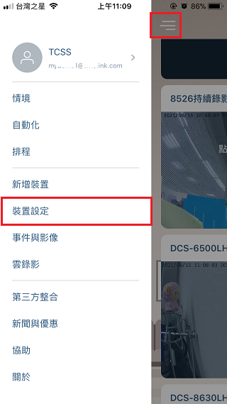 1. 登入Mydlink後點開左上三條線「選單」,再點選「裝置設定」後,點選您要設定的攝影機型號繼續。