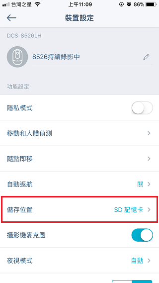 2. 接著點選「儲存位置」,並勾選到「SD記憶卡」後,點選「錄影類型」繼續。