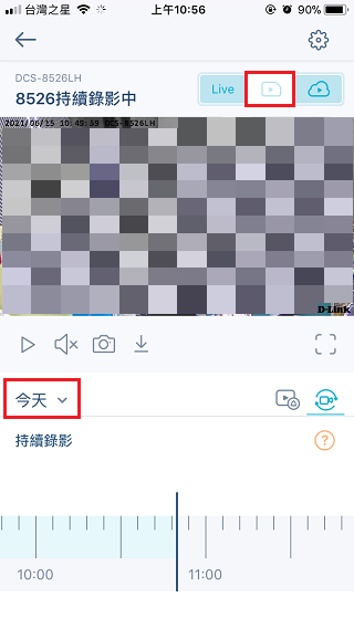 4. 回放: 若要查看持續錄影回放,請點開即時影像後,點選右上角SD卡圖示,下方即會顯示回放時間軸。