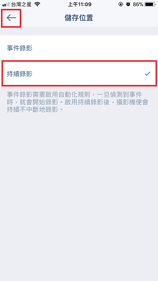 ★若啟用持續錄影則不會有任何事件紀錄保存;您設置的自動化規則仍會在觸發時推播通知,但點選通知後定向到的事件紀錄將無法查看影片,請點選持續錄影途徑回放。