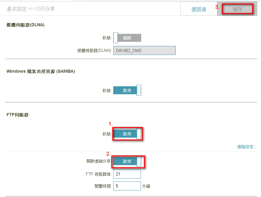 2.FTP伺服器狀態點選『啟用』 →開啟遠端分享器點選『啟用』→『儲存』