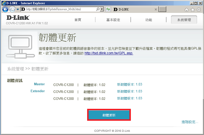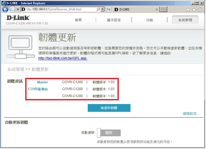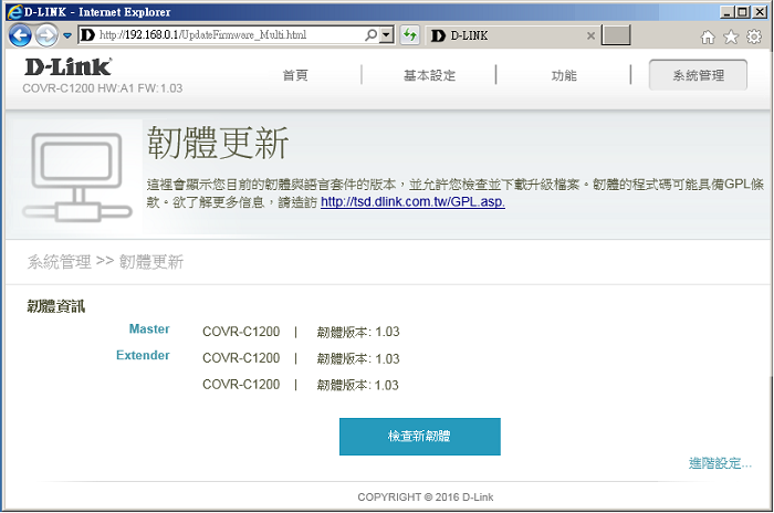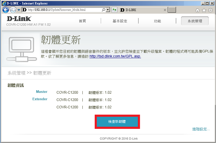 3. 畫面可看到您的主機(Master)與延伸器(Extender)目前韌體版本,請點選「檢查新韌體」。