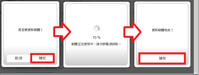 9. 此時畫面會詢問是否要更新韌體,按下確定後稍待韌體更新完成再次點選「確定」。