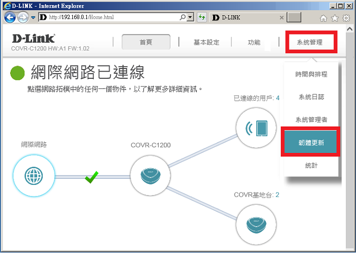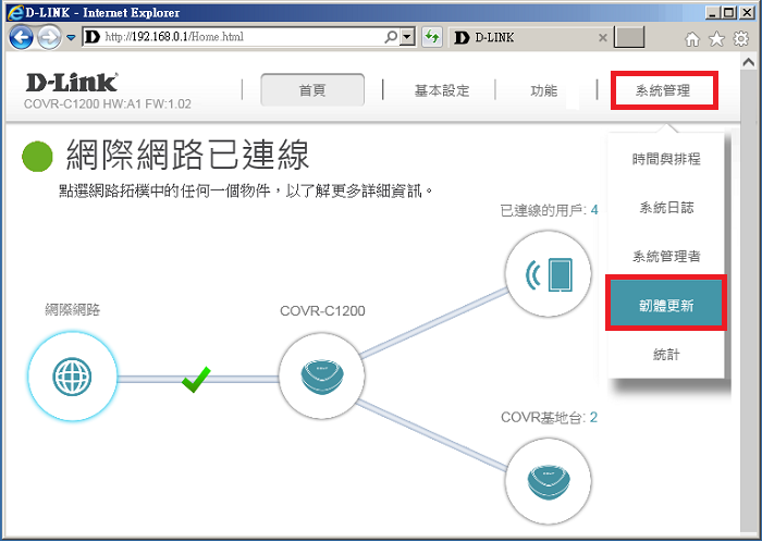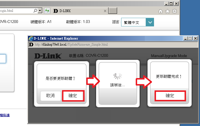 ★若您使用(A)(C)方式線上更新韌體,請務必確認COVR-C1203已能正常連線上網,三台燈號皆為白燈恆亮。