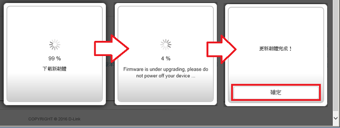 5. 此時畫面會先下載新韌體,待韌體下載完成後會自動開始更新,畫面以%顯示更新進度,更新完成後請點「確定」。(韌體更新約需5分鐘,過程中請勿插拔設備電源,以免韌體更新失敗造成設備故障。)