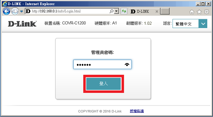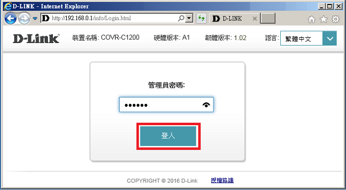 1. 請開啓電腦的網際網路瀏覽器,並於網址輸入「192.168.0.1」或「http://covr.local./」進入路由器管理頁面,請點選「登入」。(電腦請確認連到COVR-C1203的WiFi訊號;登入預設無密碼,若設備有設定管理密碼,請輸入您的密碼。)