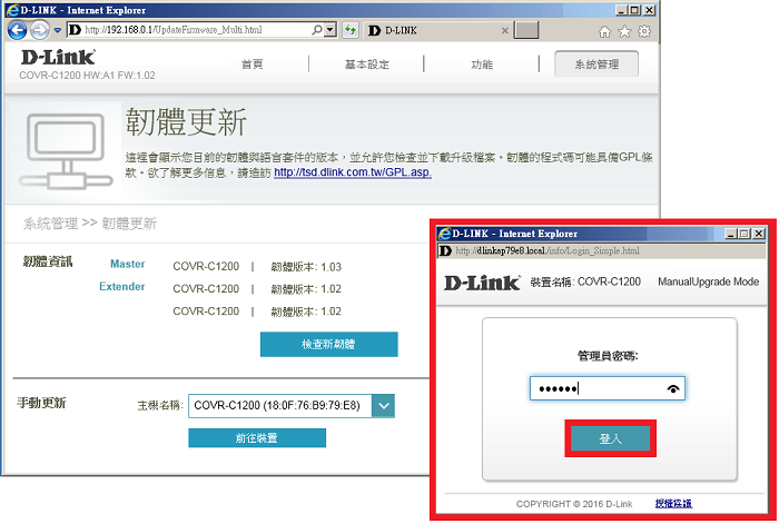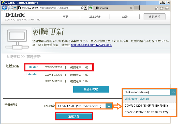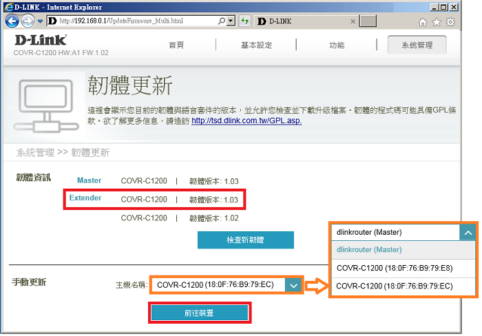 10. 更新完成後再次登入(重複步驟1、2)可看到(Extender)目前韌體版本也已顯示為新版韌體;接著更新另一台子機(Extender)請將主機名稱選擇另一台子機後點選「前往裝置」(重複步驟7~9)。