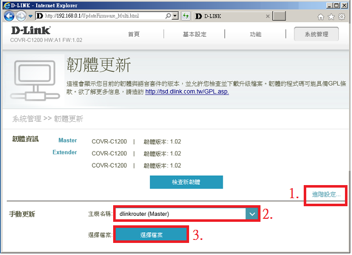 3. 點開「進階設定」後確認手動更新的主機名稱選在「dlinkrouter(Master)」,點選「選擇檔案」。