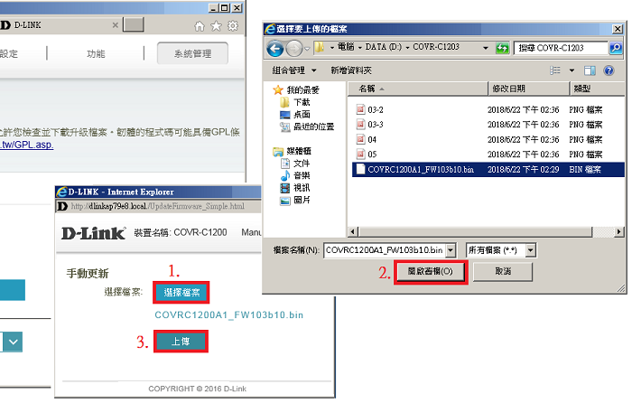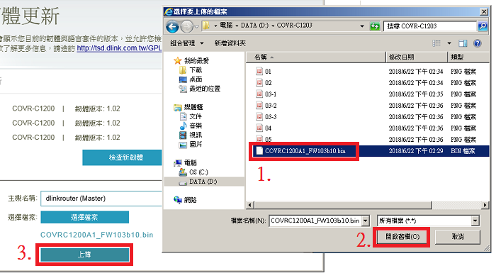 4. 接著選擇電腦中已下載的韌體檔案後依序點選「開啟舊檔」→「上傳」。
