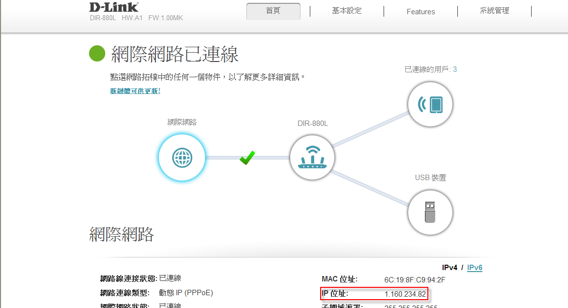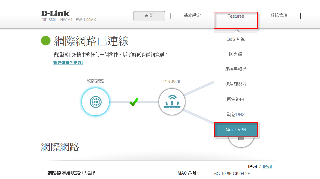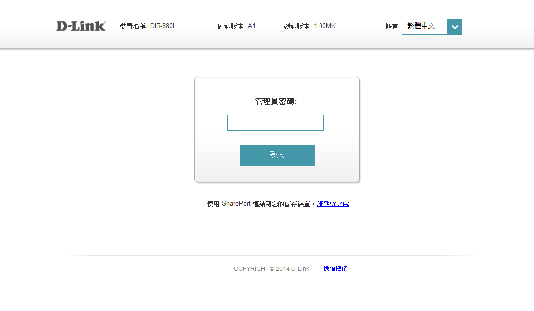 1、 此以韌體版本1.00為範例,登入DIR-880L的設定網頁,預設位址為http://192.168.0.1