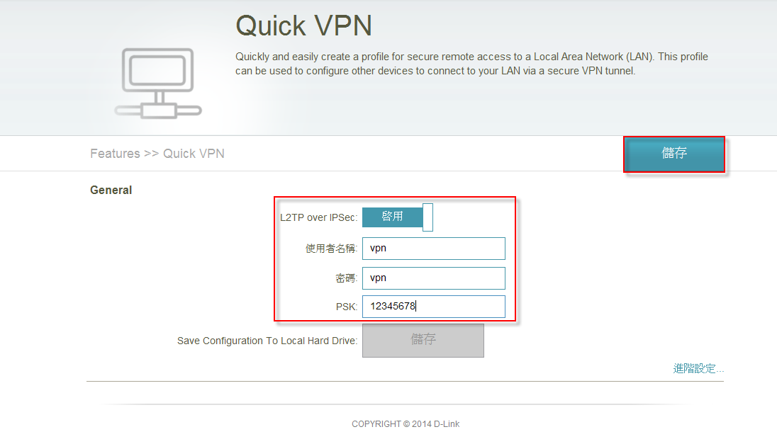 3、啟動L2TP over IPSec 功能,輸入欲設定的使用者名稱及密碼及PSK 密鑰,之後按下儲存。