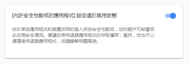3.檢查點選【我的帳戶】→點選【登入和安全性】,查看【具有帳戶存取權的應用程式】欄位中的[允許安全性較低的應用程式] 設定是否啟用。