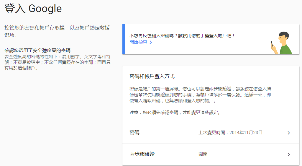 登入Gmail帳號,點選【我的帳戶】→點選【登入和安全性】,查看【登入Google】欄位中的密碼和帳戶登入方式的【兩步驟驗證】是否【關閉】。