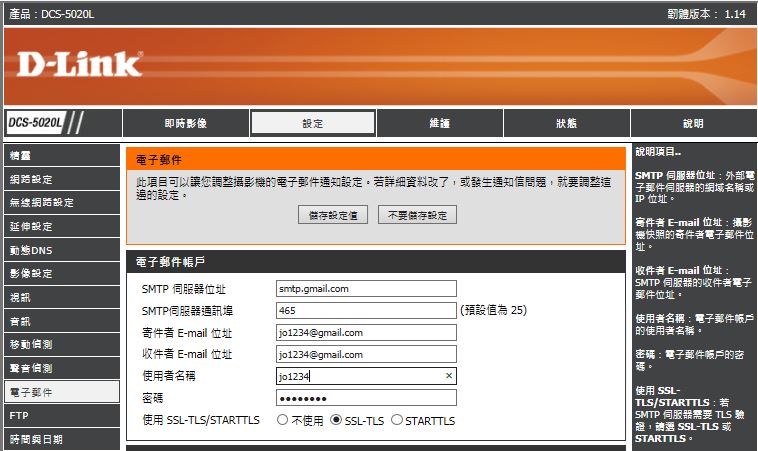 若使用SSL-TLS/STARTTLS選擇【SSL-TLS】,則SMTP伺服器通訊埠【465】(備註1)。