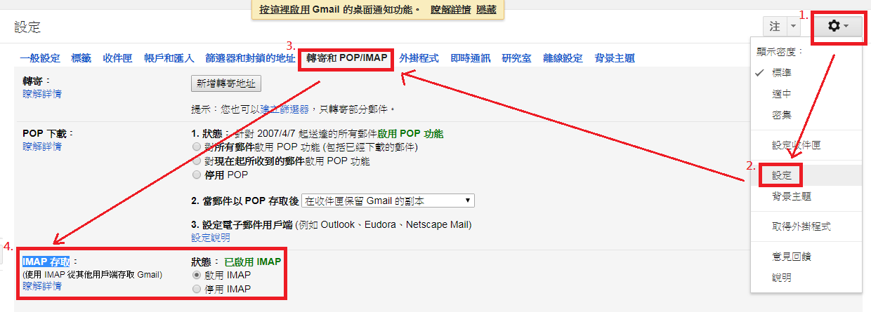 請先登入Gmail信箱點選【齒輪】→【設定】→【轉寄和POP/IMAP】→【啟用IMAP】。