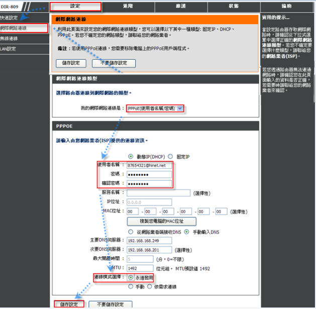 密碼:請輸入由ISP業者提供給您的PPPoE密碼。