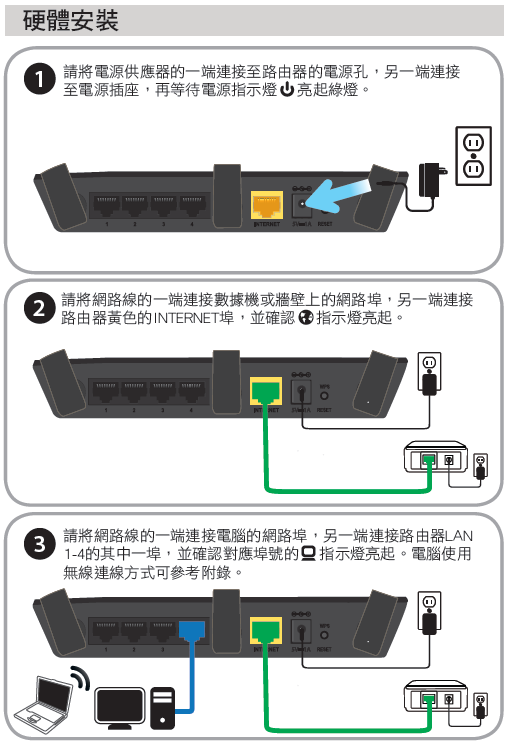 將數據機的線路接到DIR-809的INTERNET埠,電腦的網路線接到LAN埠1~4其中一個