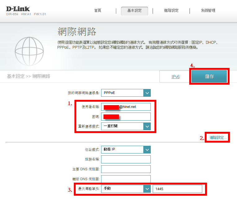 *ADSL申辦速率為8M以上或光纖者,請點選「進階設定」的MTU值(封包傳送單位):建議改為1445