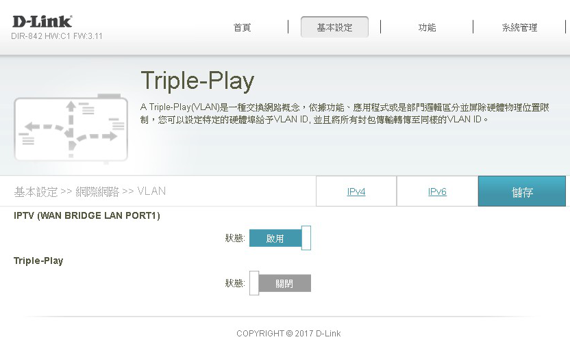 說明:DIR-842 (硬體版本C1版) 新版韌體支援IPTV功能。可提供連接一台MOD設備至LAN1埠。使用前請先更新韌體至v3.11版本。