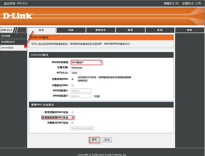 Internet設定中的WAN存取類型:點選DHCP動態IP