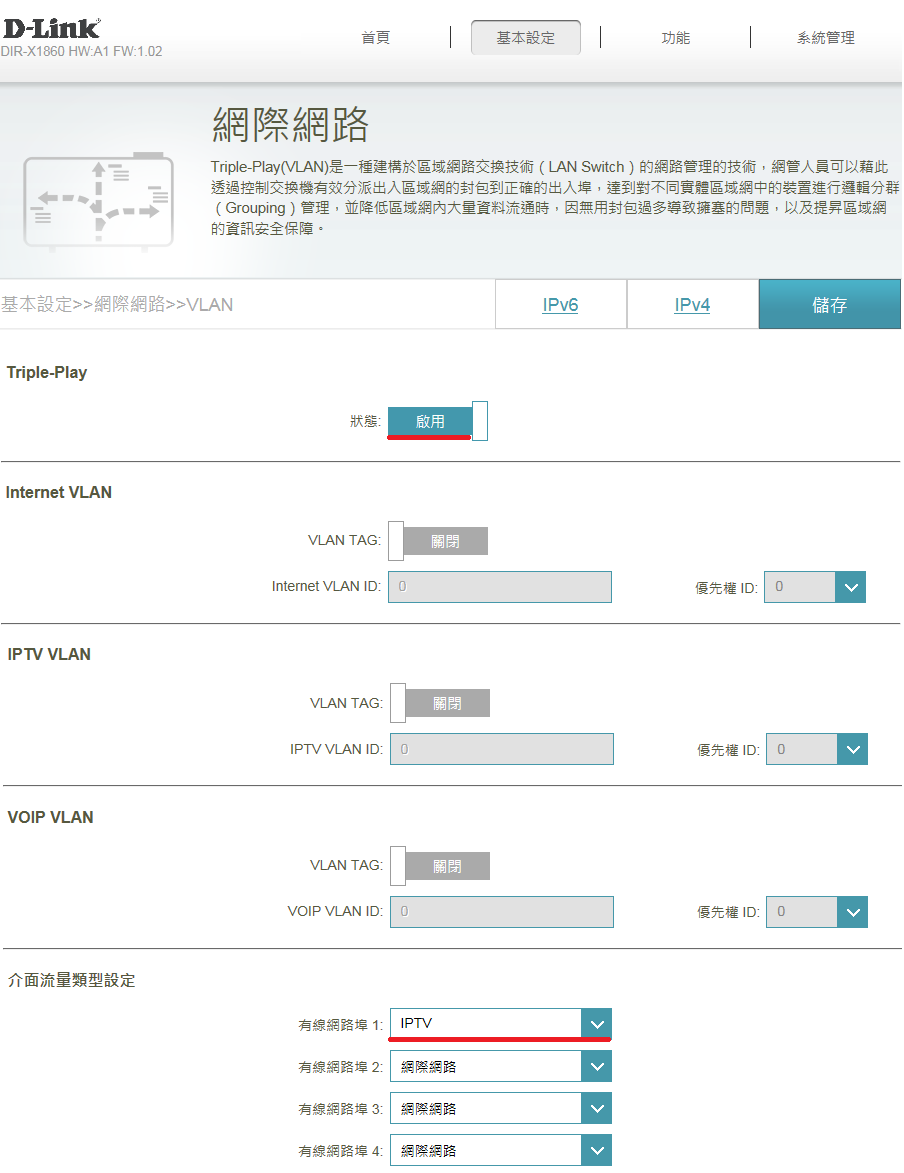 【介面流量類型設定】內的 有線網路埠1 選擇IPTV