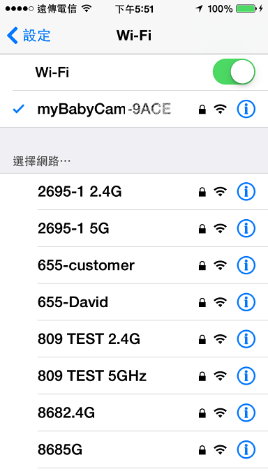2. 手機開啟WI-FI,搜尋並連線DCS-825L 的無線網路名稱 myBabyCam-XXXX