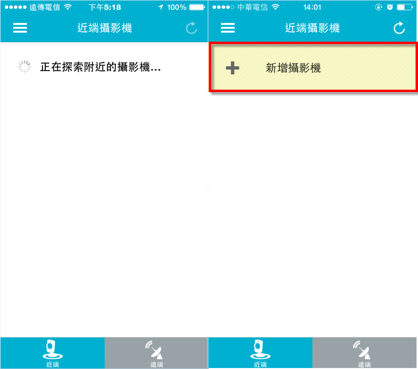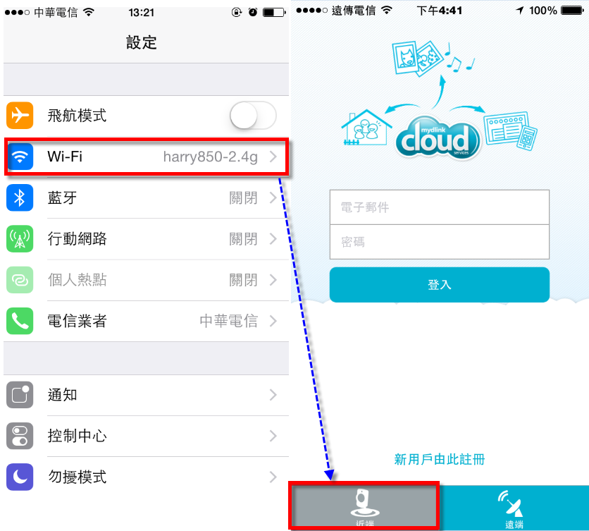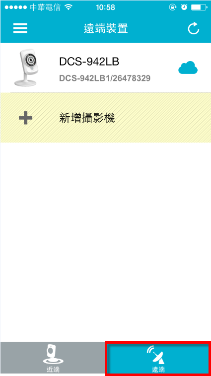 請將手機WI-FI連線至同一無線網路(2.4GHz)→開啟mydlink Lite App 點選“近端”