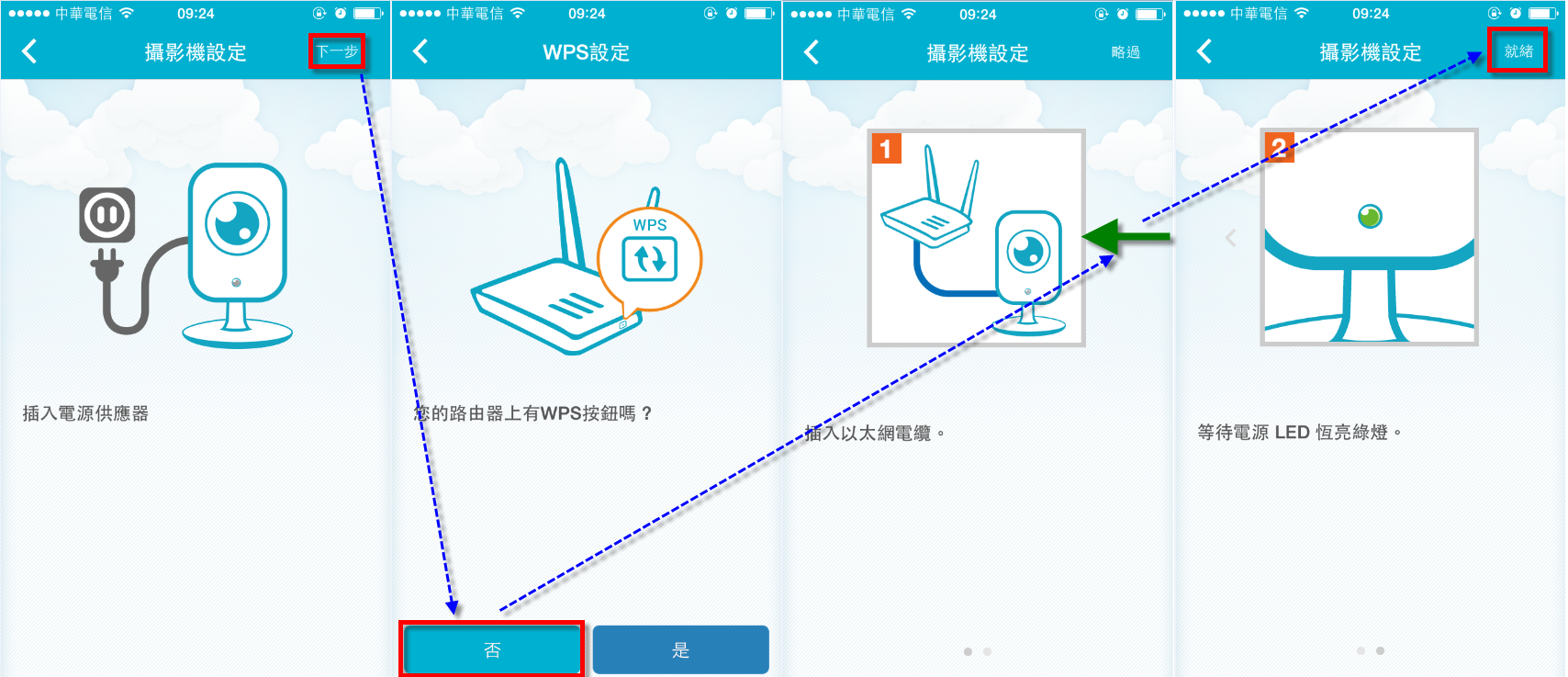 攝影機設定請插入電源後點選「下一步」→WPS設定請點選「否」→