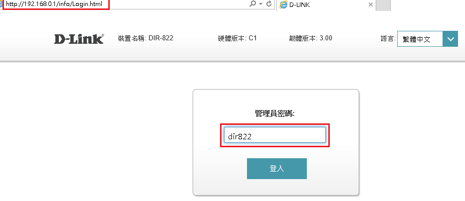 1.開啟 瀏覽器 ,在網址列輸入 192.168.0.1 到DIR-822 管理頁面,管理員密碼預設為空白,點選登入