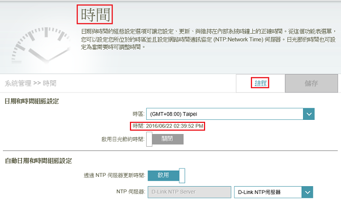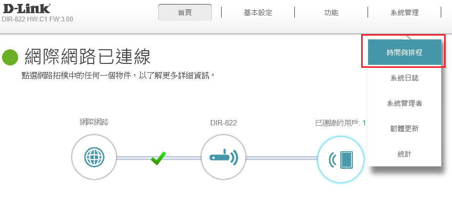 2.請到 「系統管理」à 「時間與排程」à 請先將DIR-822 校時
