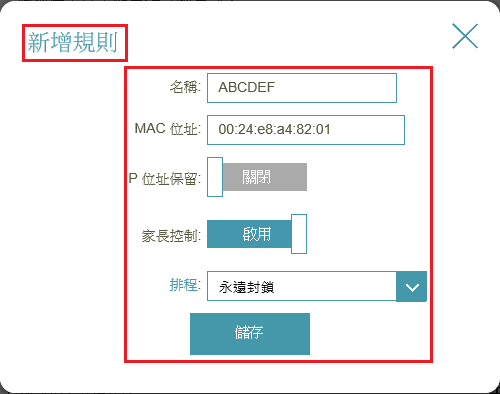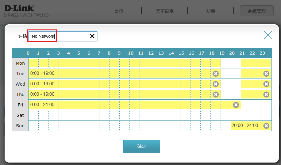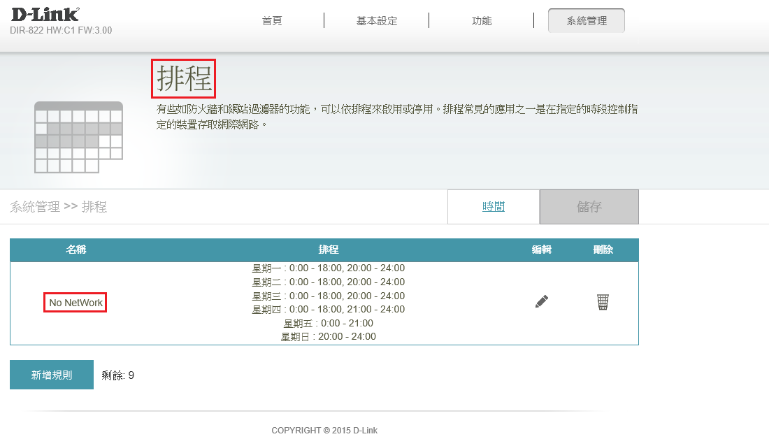 DIR- 822提供家長控制功能,可搭配自訂時間排程,家長可用來限制底下有線或無線裝置上網連線.