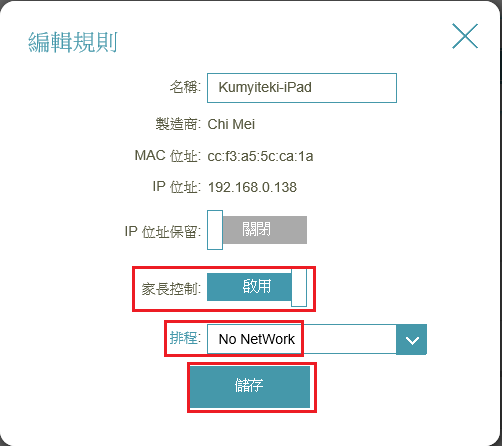 8. 開啟家長控制功能,並選擇No Network套用此時間排程,點選儲存
