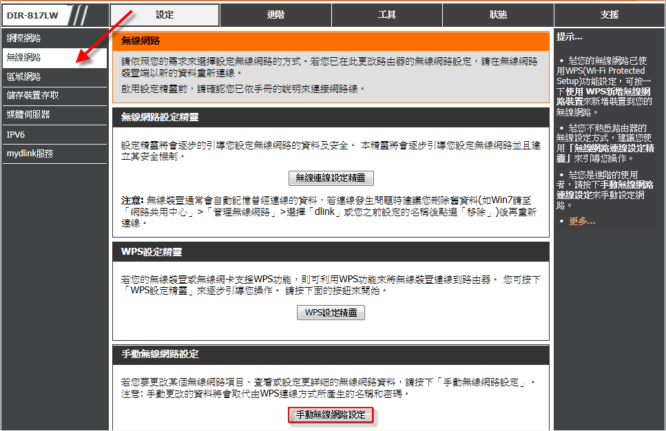 2. 點選《設定》,選擇左邊選項的《無線網路設定》,再點選《手動無線網路設定》