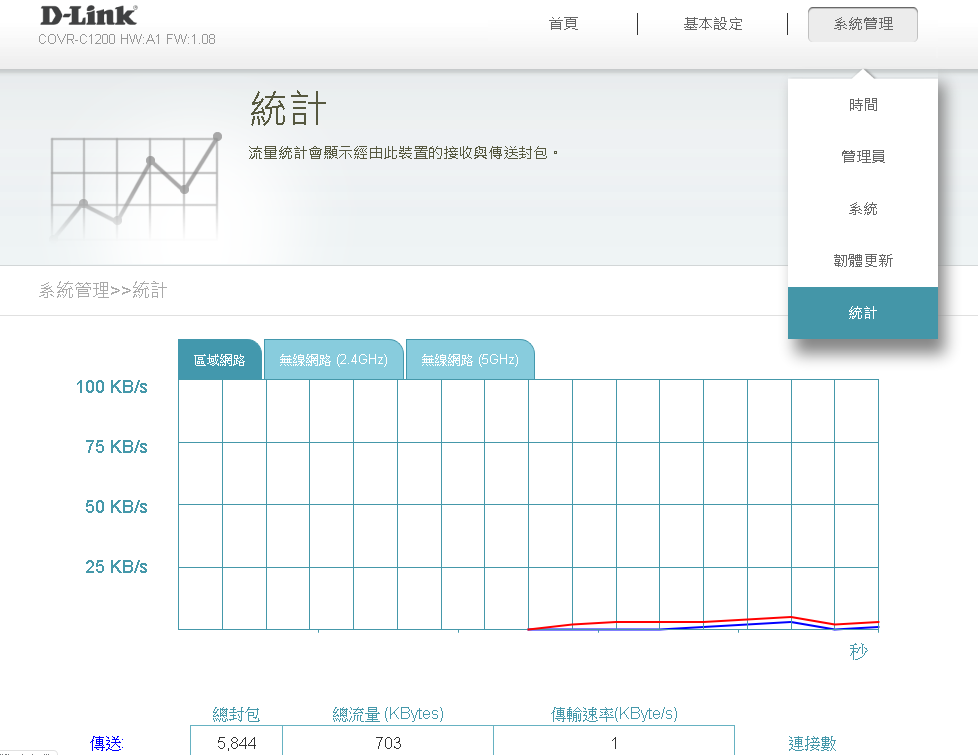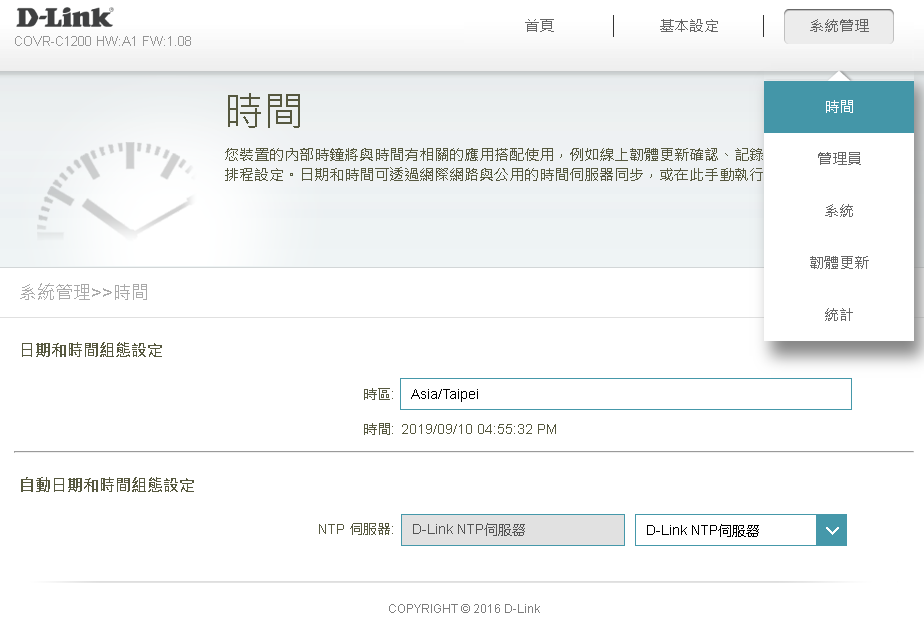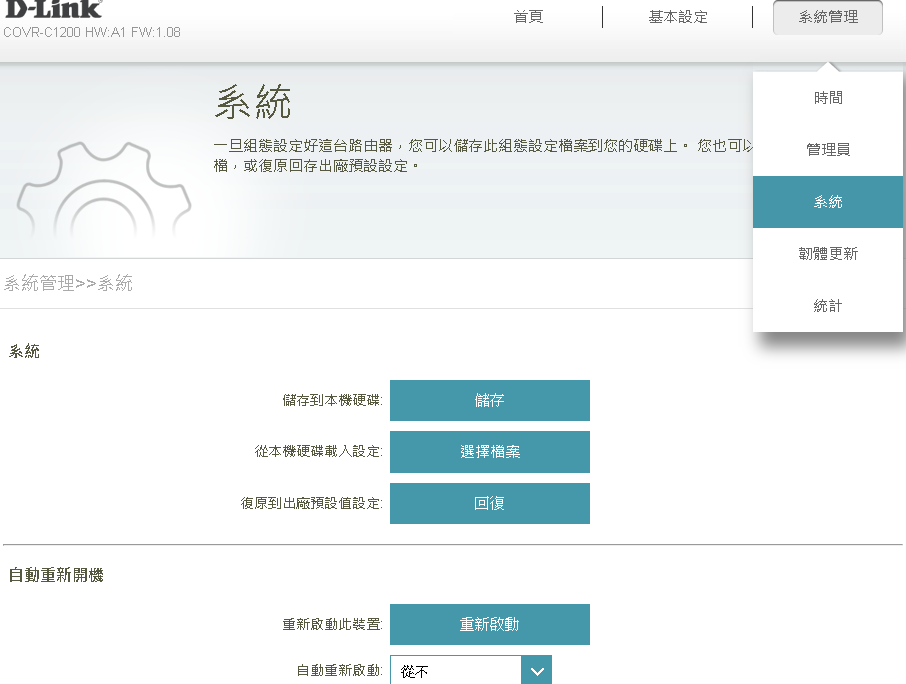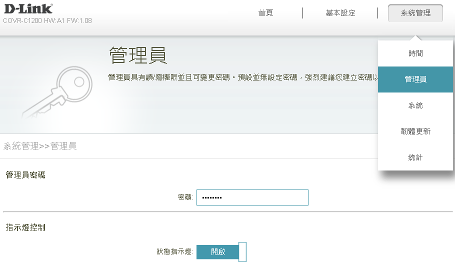系統管理會有五個選項:時間、管理員、系統、韌體更新、統計。