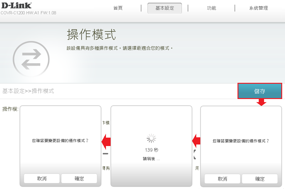 步驟四:點選 [ 儲存 ] 等候倒數完按確定即可,子機無需設定會自動延伸主機的無線訊號。