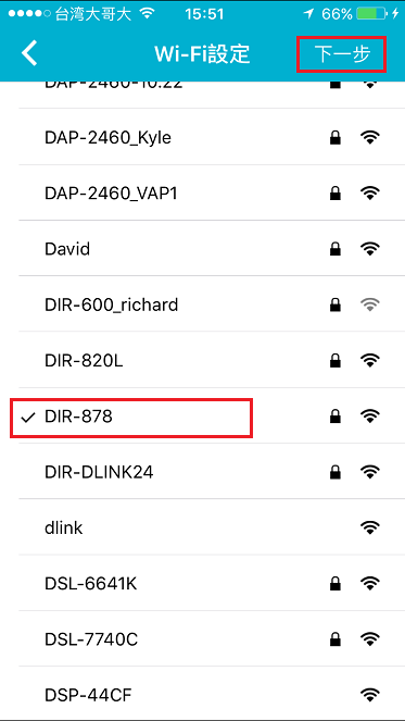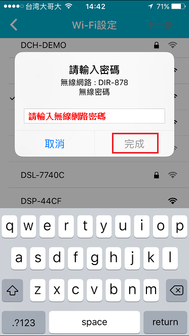 步驟七:Wi-Fi設定 選擇家中無線網路名稱、輸入無線網路密碼後點完成,選右上方的【下一步】