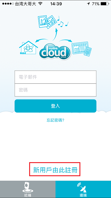 請將手機WI-FI連線至無線網路(2.4GHz)→開啟mydlink Lite App 點選“新用戶由此註冊”,若已經註冊過的用戶請先登入Mydlink帳號後點選“新增攝影機”
