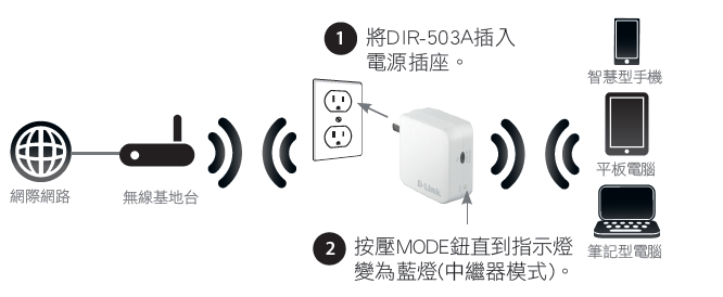 可將DIR-503A當成無線中繼站來加大無線的涵蓋範圍,將無線網路做最佳的利用。