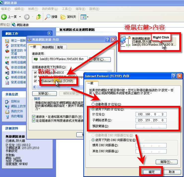 控制台>網路連線>無線網路連線右鍵內容>TCP/IP內容>使用下列指定IP