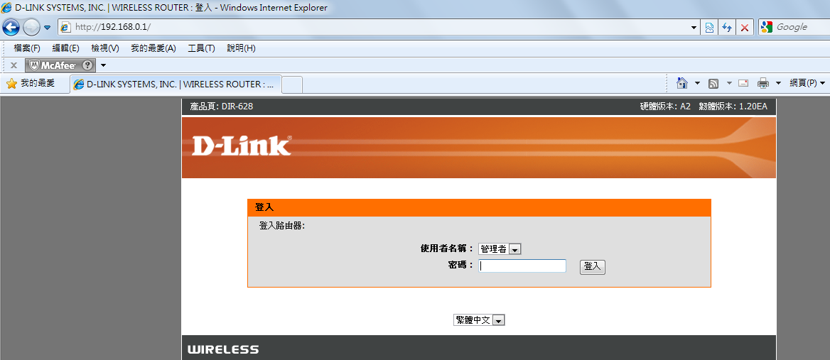 1.請在網址列輸入192.168.0.1 使用者名稱: admin 密碼: 空白