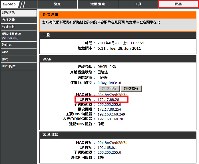 若無取得IP位址請點選「DHCP更新」稍後顯示IP位址,已可對外連線上網了。