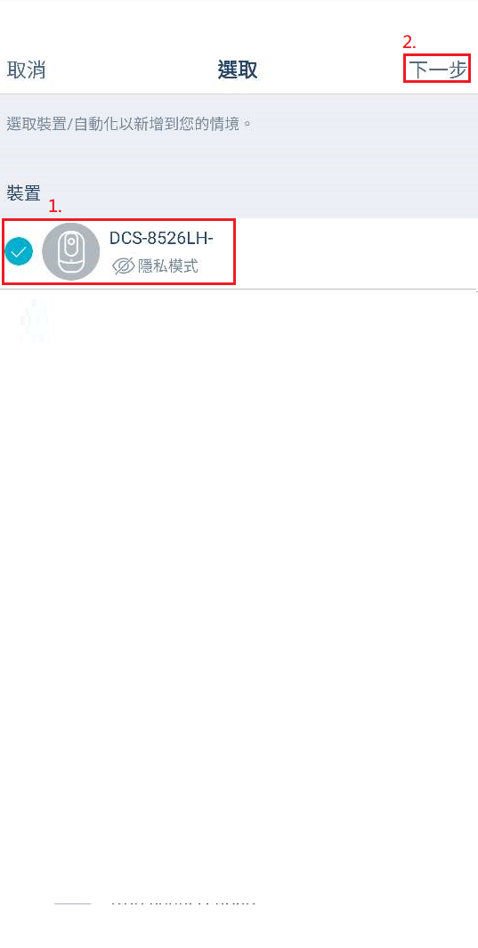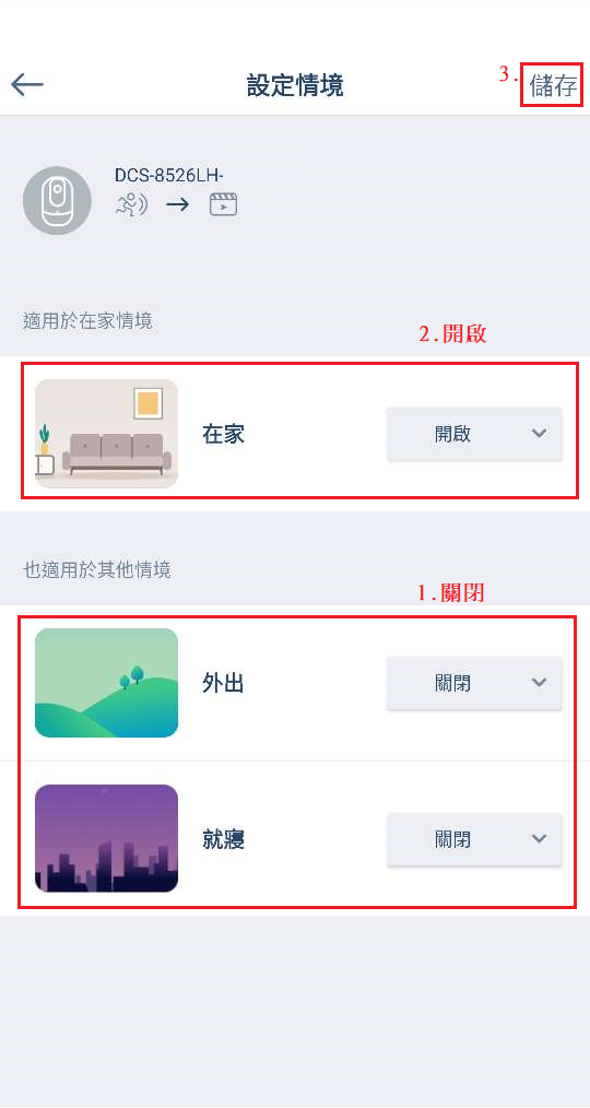 5. 勾選 自動化1(偵測到移動觸發錄影加通知) > 下一步,將在家和就寢關閉自動化1,外出開啟自動化1然後儲存。