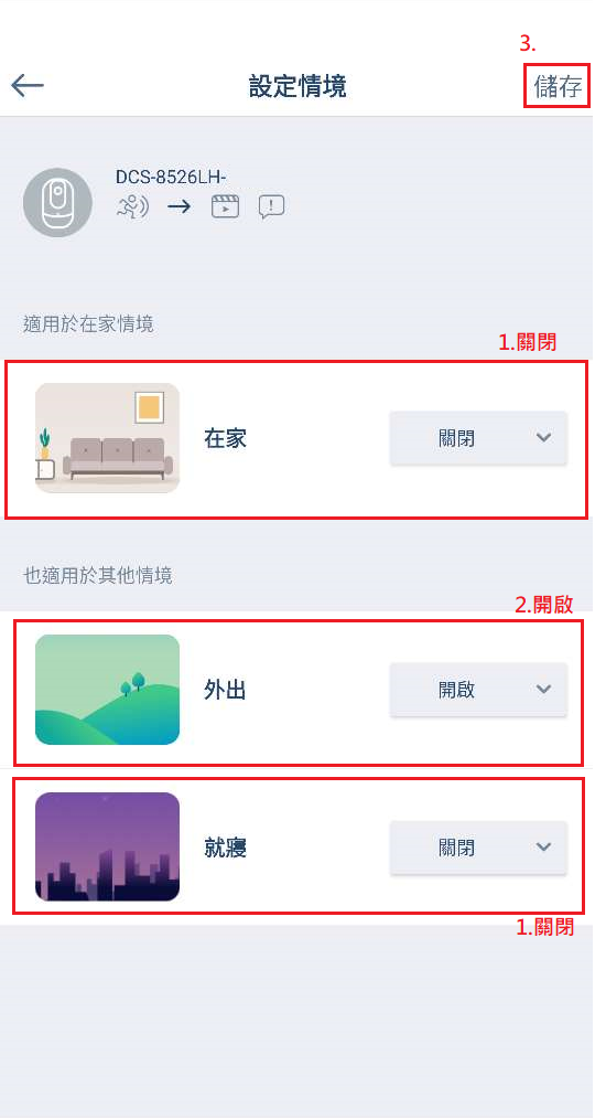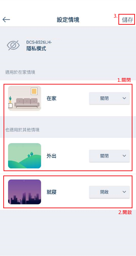 4. 不同情境下個別設定隱私模式開關,在家和外出關閉隱私模式,就寢開啟隱私模式然後儲存。